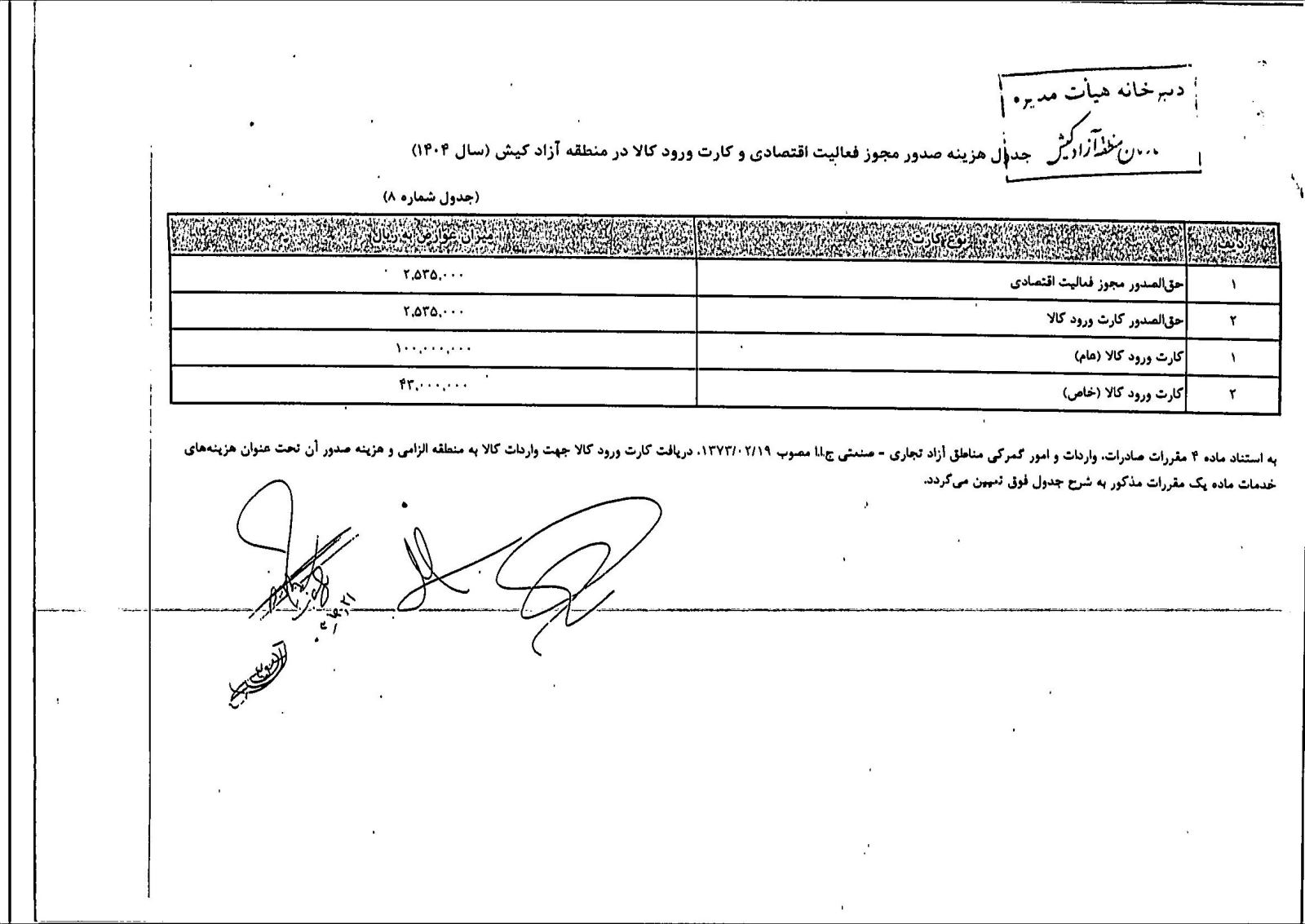 جدول هزینه صدور مجوز فعالیت اقتصادی و کارت ورود کالا (سال 1404) جدول هزینه صدور مجوز فعالیت اقتصادی و کارت ورود کالا در منطقه آزاد کیش (سال 1404)